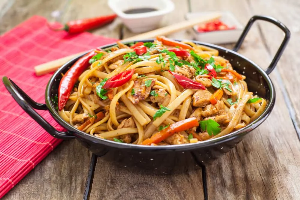 Put garlic and ginger in the wok, stir-frying for a minute until fragrant. Add in mushrooms and stir-fry them for 2 minutes before adding snow peas, stock, noodles, and sauces. Stir-fry them for another 2 minutes. Add in the rest of the sesame oil, bean sprouts, and chicken and stir-fry everything for a minute. Put some chili in the mixture and serve with lime.