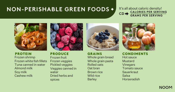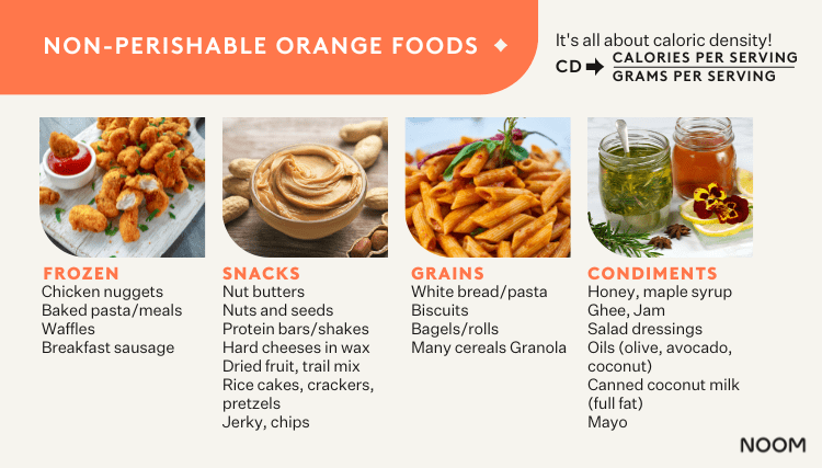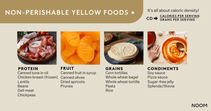 A group of Noom Health Coaches put together a list of shelf-stable orange, yellow, and green foods to help make healthy eating simple. We’ve also added some tips along the way to help you pair and prep these foods as part of a healthy diet!