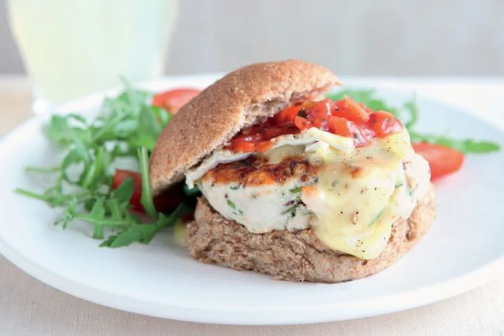 3. Serve the burgers in the buns topped with Brie and a spoonful of spicy salsa.