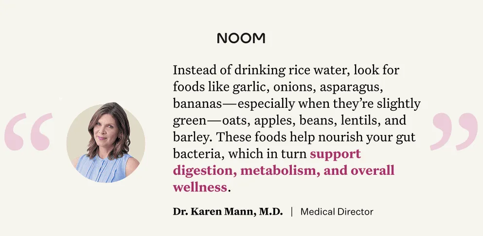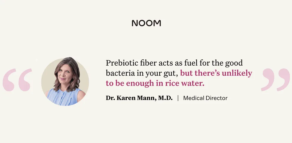 “Prebiotic fiber acts as fuel for the good bacteria in your gut,” explains Dr. Karen Mann, Noom Medical Director. “When these microbes break it down, they produce short-chain fatty acids, which help strengthen your gut lining and may even play a role in regulating metabolism and appetite. But there’s unlikely to be enough in rice water.”