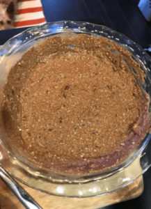 4) Diese Masse nun in die Kuchenform geben und fest drücken, auch am Rand. Decke die Kuchenform mit Frischhaltefolie ab und lege die Kuchenform in die Gefriere, während du die nächste Schicht mixt.