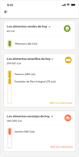 Para explicarlo, aquí hay un poco más de información útil y datos curiosos: Noom determina tu presupuesto calórico diario tomando en cuenta tu altura, peso, sexo, edad y objetivo semanal de pérdida de peso. Para ayudarte a saber cómo usar estas calorías y perder peso, Noom divide tu presupuesto diario en las categorías NARANJA, AMARILLO y VERDE. Estos alimentos son clasificados por colores acorde a su densidad calórica. Los alimentos y bebidas en la lista NARANJA y AMARILLA son más densos en calorías que los de la lista VERDE (por ejemplo, 1 onza de lechuga romana tiene 8 calorías, 1 onza de filete a la parrilla tiene 47 calorías, 1 onza de papas fritas tiene 154 calorías). Mientras que los alimentos NARANJAS y AMARILLOS no se consideran malos, el límite que ves en la aplicación te indica que seas más consciente al comer estos alimentos que tienen más calorías por unidad de peso. Esto se debe a que algunas porciones pueden ocupar rápidamente tu presupuesto ¡y dejarte con hambre por el resto del día!